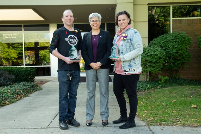“I remember getting a call for potentially being a candidate for this award, and it was very humbling,” said Katie Sowers, a 2009 Goshen College graduate and a 2022 alumni awardee. “I remember there was some hesitancy on whether or not I’d accept the award, based on my experiences in the past. And, it was a no-brainer for me. This is a college that I love and I would be honored to accept this award. Coming back here has been even more reassuring to me as to why I decided to come here in the first place, even though it had a different belief system at the time. It’s all a process of life and learning, and to see Goshen evolving is exactly what I want out of any school that I’d have my children attend.”