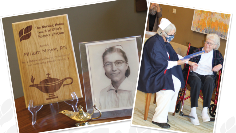 The Ohio’s Hospice Nursing Honor Guard recently recognized Miriam “Mim” Meyer, a patient of Ohio’s Hospice LifeCare, for her compassionate service to nursing.