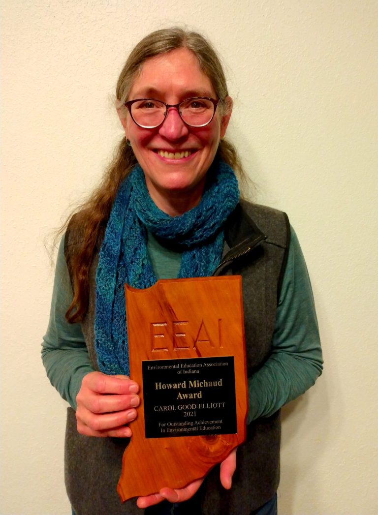 Carol Good-Elliott, longtime environmental educator at Merry Lea Environmental Learning Center of Goshen College, was awarded the Howard Michaud Award from the Environmental Education Association of Indiana (EEAI) for her lasting commitment in the field of environmental education.