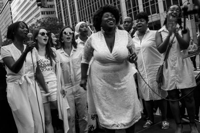 The Resistance Revival Chorus (RRC) is a collective of more than 60 womxn (an alternative spelling of the English word “woman”) and nonbinary (gender identities that are neither male nor female) singers who join together to breathe joy and song into the resistance, and to uplift and center womxn’s voices. Chorus members are touring musicians, film and television actors, Broadway performers, solo recording artists, gospel singers, political activists, educators, filmmakers, artists and more, representing a multitude of identities, professions, creative backgrounds and activist causes. They center womxn in music, and address how historically womxn have been marginalized in the music industry. The great artist and activist Harry Belafonte once said, “when the movement is strong, the music is strong,” and RRC attempts to live up to that call. The RRC calls for justice and equity for womxn across racial, ethnic, economic, sexual identity and religious lines. They aim to be intersectional in their feminism and reveal that all social justice issues overlap heavily with womxn’s issues; to harness the collective power of womxn to help change the world; to celebrate each other through song; to embrace Toi Dericotte’s idea of “joy as an act of resistance.”