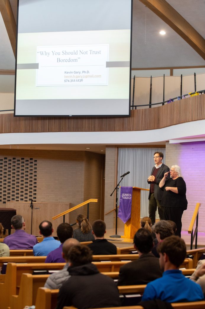 On Wednesday April 10, 2024, Goshen College campus gathered to highlight research conducted by students and faculty during the annual Academic Symposium. The keynote speaker was Kevin Gary, Ph.D. who presented “Why You Should Not Trust Boredom”.