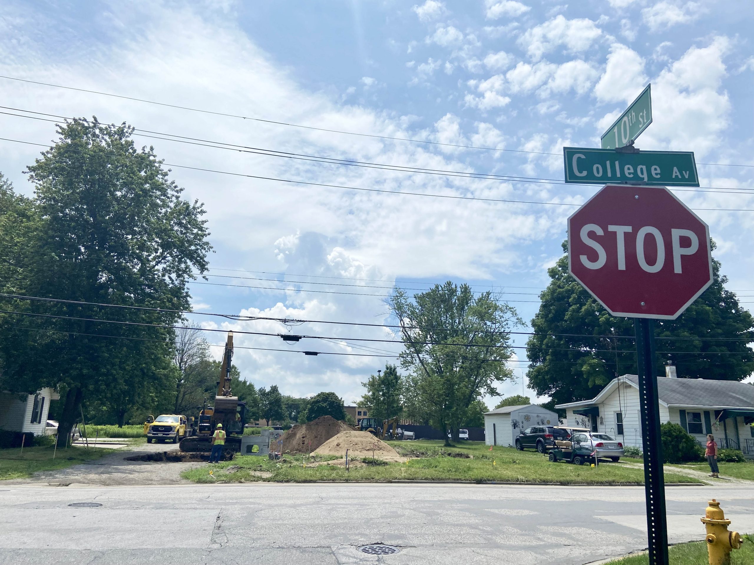 The first phase of a new entrance project to the Goshen College campus is underway at College Avenue and 10th Street. Construction work has begun, requiring the removal of one house with plans to remove a second house next year.