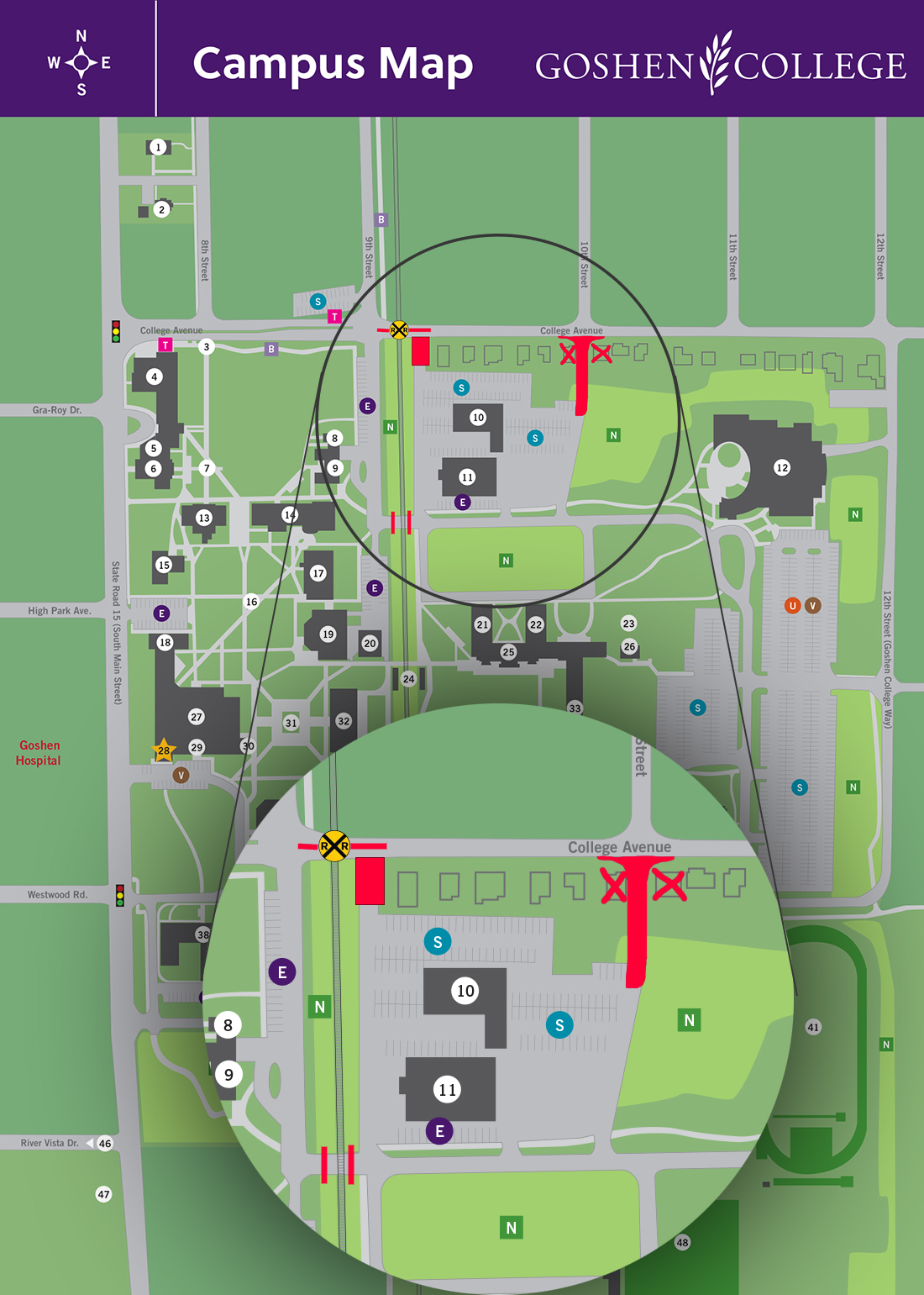 The creation of a new more prominent entrance from College Avenue is part of the college’s long-term campus master plan and will provide easier access to the Music Center, home to the Community School for the Arts and numerous public performances. In addition, the initial work this summer is in response to the development by the city of a quiet zone (where trains won’t sound their horns as they approach crossings) along 9th Street, which includes installing a delineator on College Avenue and requires the college to close the entrance to campus just east of the train tracks. The railroad crossing on campus that is currently accessible to all traffic will be converted into a pedestrian/utility vehicle crossing for safety reasons.