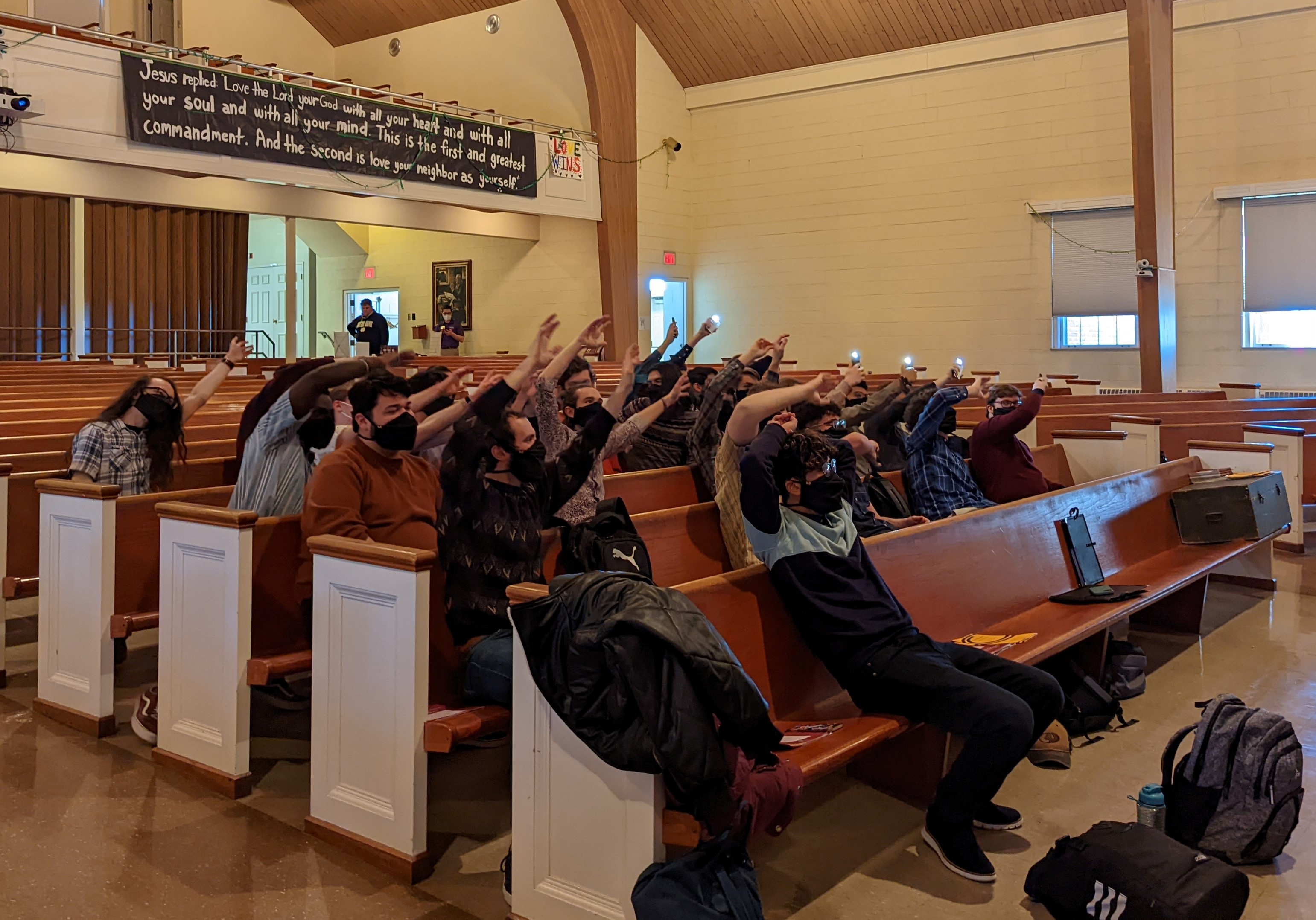 After a box lunch from the Dock cafeteria, we quickly left and made our way to the second and final school for today, Lancaster Mennonite. Due to some nasty traffic, we didn’t arrive until right before we were supposed to perform, so we had little to no warm-up or rehearsal available to us. Despite that, we gave a stellar performance in Lancaster’s auditorium space, which was the largest one we have performed in so far. After school let out, there was a little bit of time before we departed. Our search for a playground proved to be fruitless, so we decided to play a rousing game of tag in the back parking lot. We were running around, laughing, sharing jokes (Dontaye didn’t know what getting “ratioed” was), and having a great time overall. Then tragedy struck. Jonah King, ’23, tripped and fell while running. After getting up and walking around for a little while, we saw his neck. The collarbone was sticking out at an angle that wasn’t normal. He was taken to the hospital by Marcia, and we had to leave on the bus without him. Despite his absence, and at Scott’s urging, we set a new count-off record of 9.87 seconds.