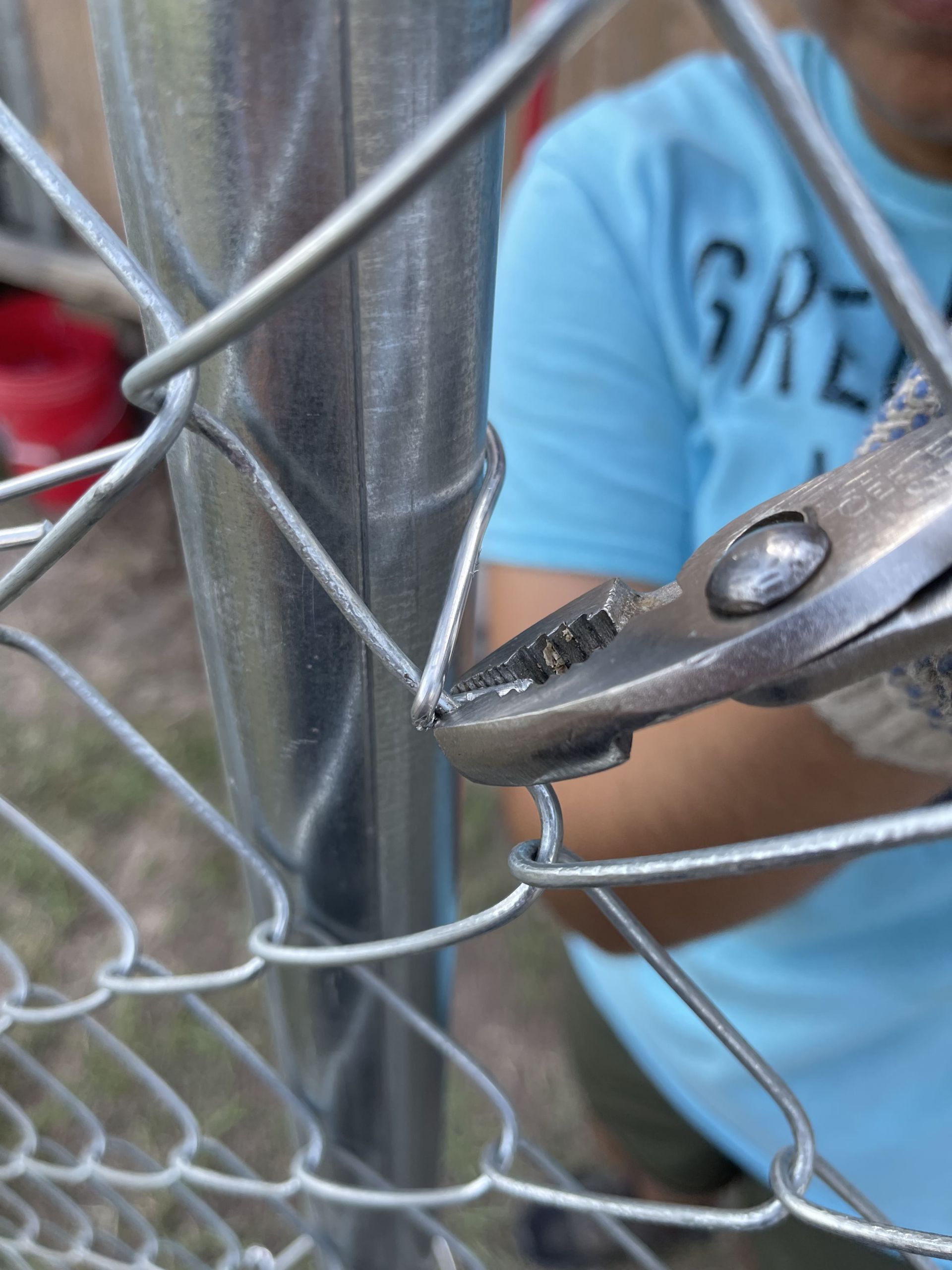Leslie Ortega y yo (Giovana Gaona) usando los alicates para torcer los cables para asegurar la cerca con los postes.