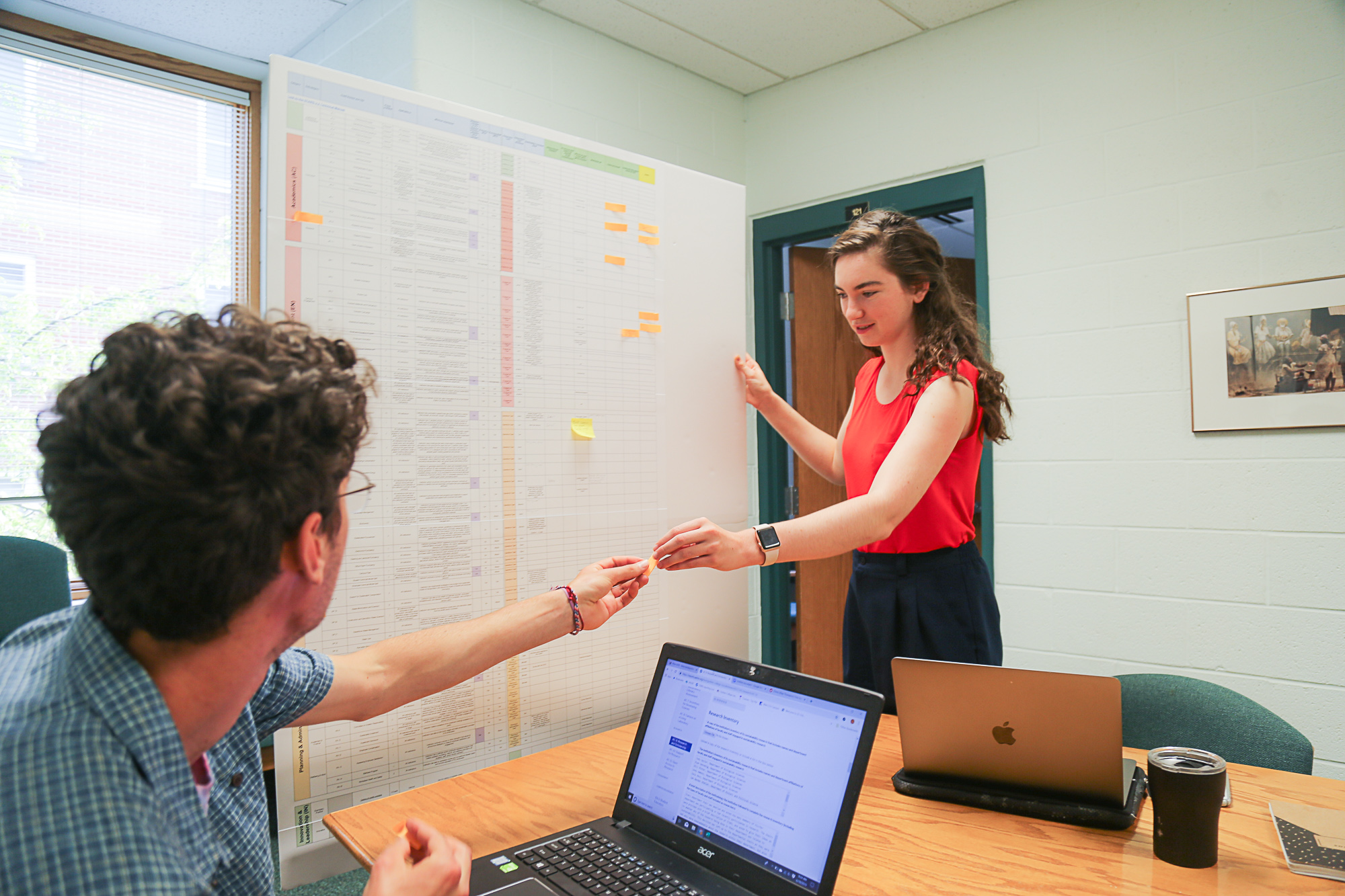 Anna McVay and Levi Ebersole organize data for their analysis of GC’s sustainability practices during a Hickory Scholars summer project in 2019.