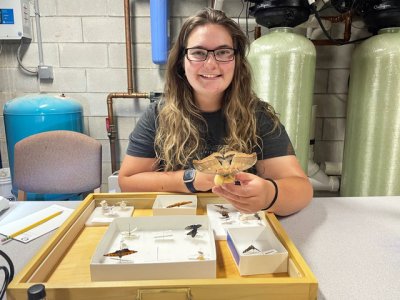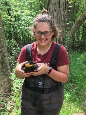 Willow Kenneda, a junior environmental and marine science major from Williamsburg, Ohio, and Kaeli Evans have teamed up to expand Merry Lea’s understanding of the population dynamics of the endangered Blanding’s turtle. Using location tracking, Kenneda seeks to answer several questions, including what habitats the turtles are using, the connections between those habitats, and where the Blanding’s turtle is in relation to other species of turtles. This research will contribute to Merry Lea’s updated turtle population and landscape data.