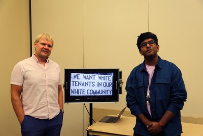 Kyle Hufford and Silas Immanuel pose next to a still from their documentary about the city’s difficult past as a sundown town