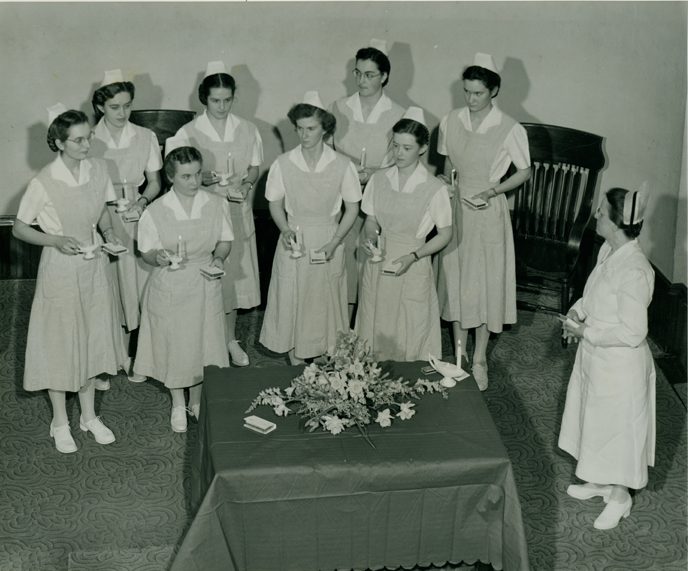 The inaugural nursing class of 1953: Back row: Ruth Beard, Florence (Rheinheimer) Harnish, Margaret (Brubacher) Ashley, Charlotte (Hertzler) Croyle Front row: Lois (Shank) Musselman, Leona (Yoder) Baker, Mary Kay Sauder, Elnora (Weaver) Voth. The instructor with them is Orpah Mosemann, director of nursing.