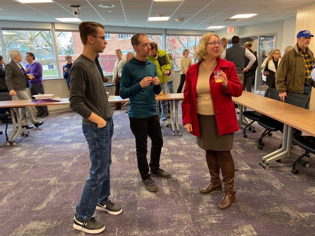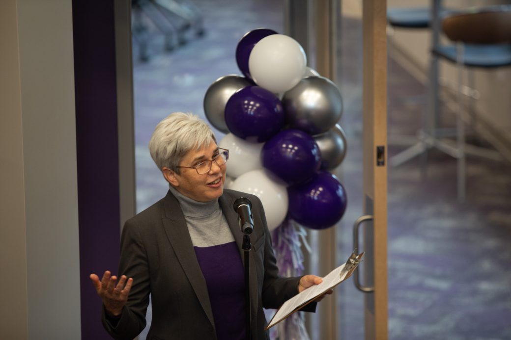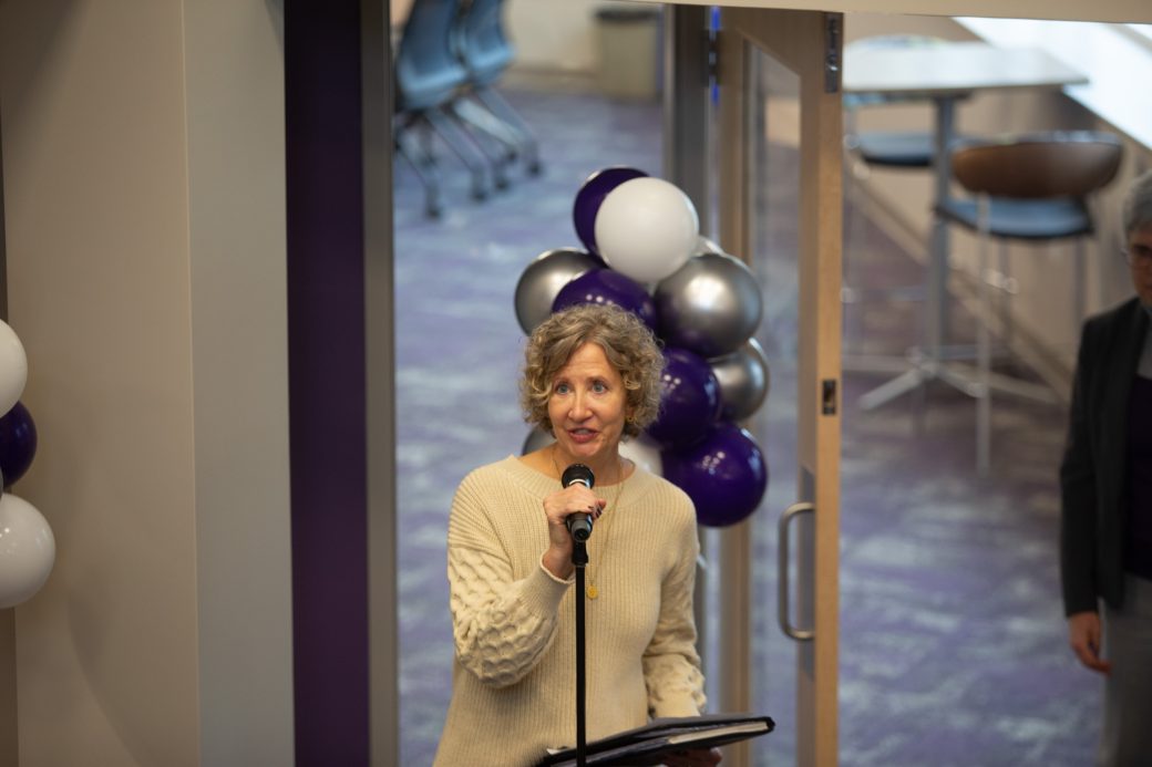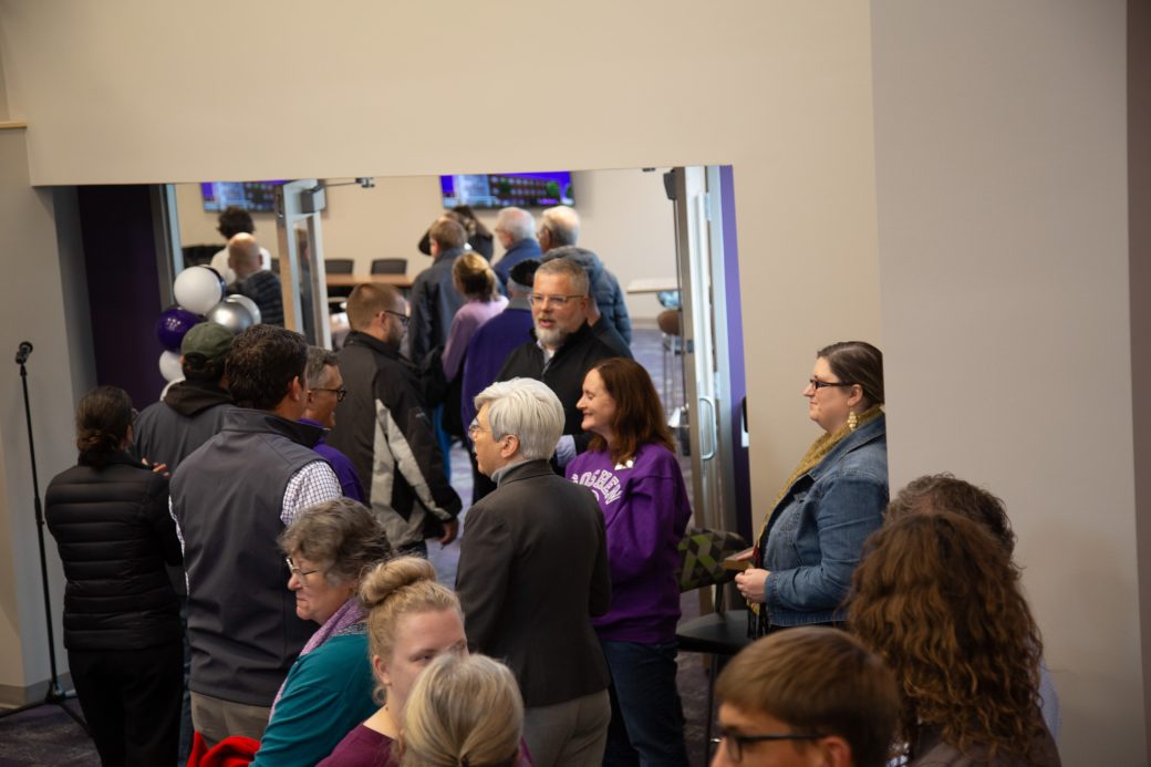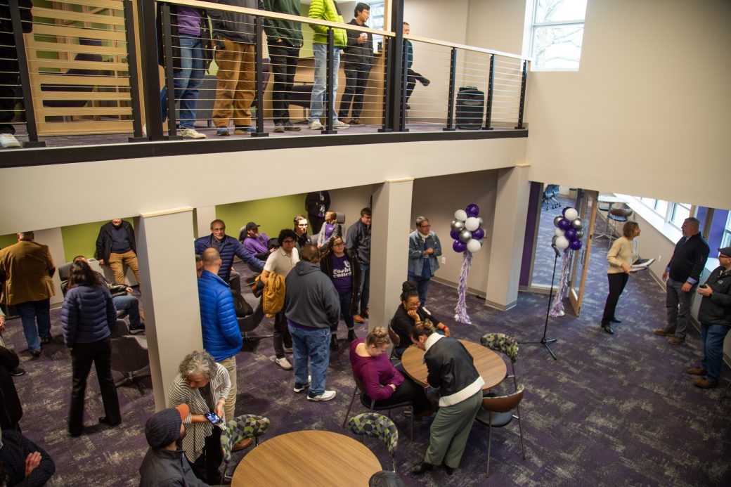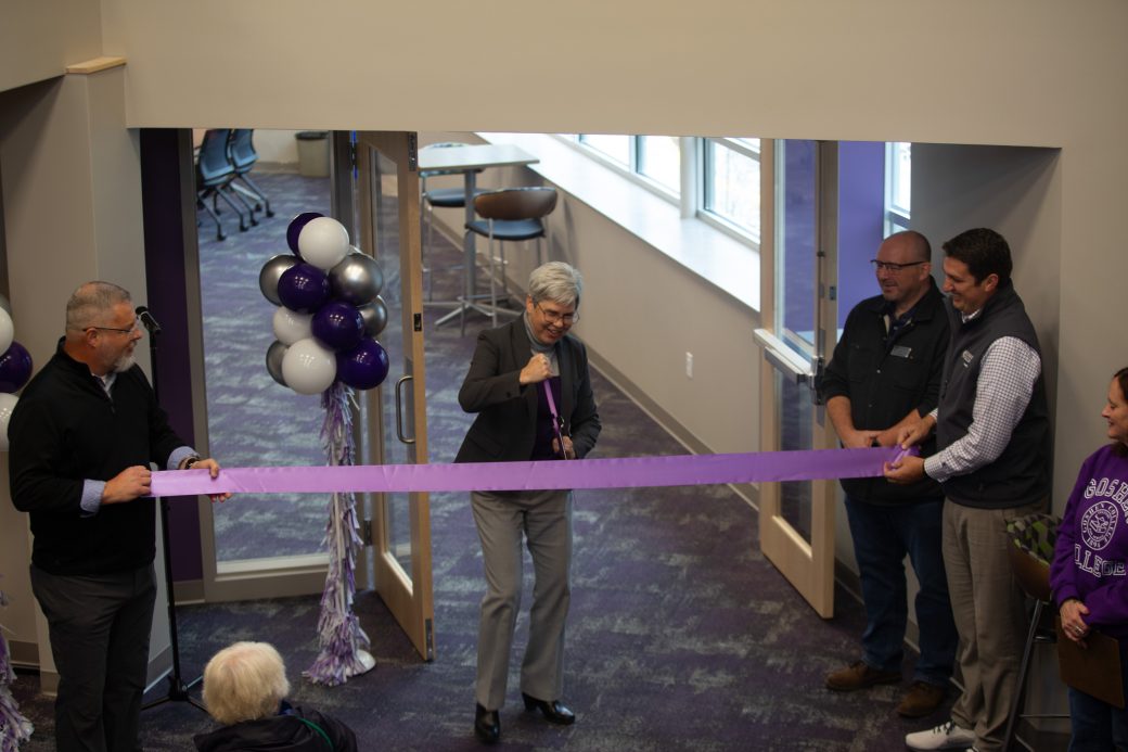 On Nov. 22, the renovated full first floor of Westlawn Hall was opened to campus to enjoy and celebrate. President Rebecca Stoltzfus offered opening words in the Gunden Commons — a new multilevel space for studying, connecting and gathering — before cutting the ribbon and celebrating the official opening. Faculty, staff, retirees and students explored the spaces — including a renovated kitchen, dining hall and a new outdoor dining area named the Miller Terrace — and enjoyed cookies in the new Mark Community Room, which will host meetings and events. A public ribbon cutting and celebration of the fully renovated building and new Center for Nursing and Public Health will take place in the spring.